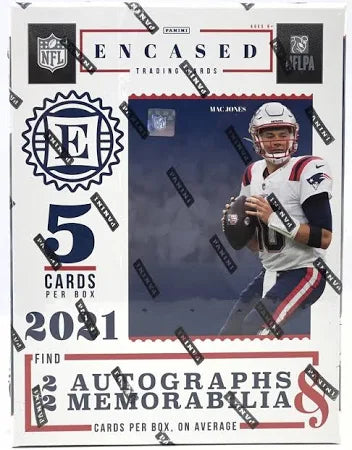 Each 2021 Panini Encased Football Hobby Box Contains One BGS-Graded Autograph, One Additional Autograph, Two Memorabilia Cards, and One Base Card!